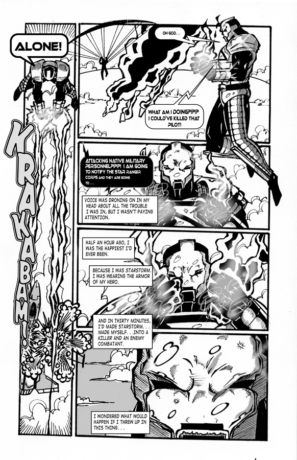 Sheldon survived his suicidal leap from the Chornskopf building last issue, but wherever he landed, it wasn’t downtown Satellite Falls.  This issue, Sheldon learns more about the origin of Starstorm and tries to clean up the mess he left up on the roof of the Chornskopf building, with deadly results. . .